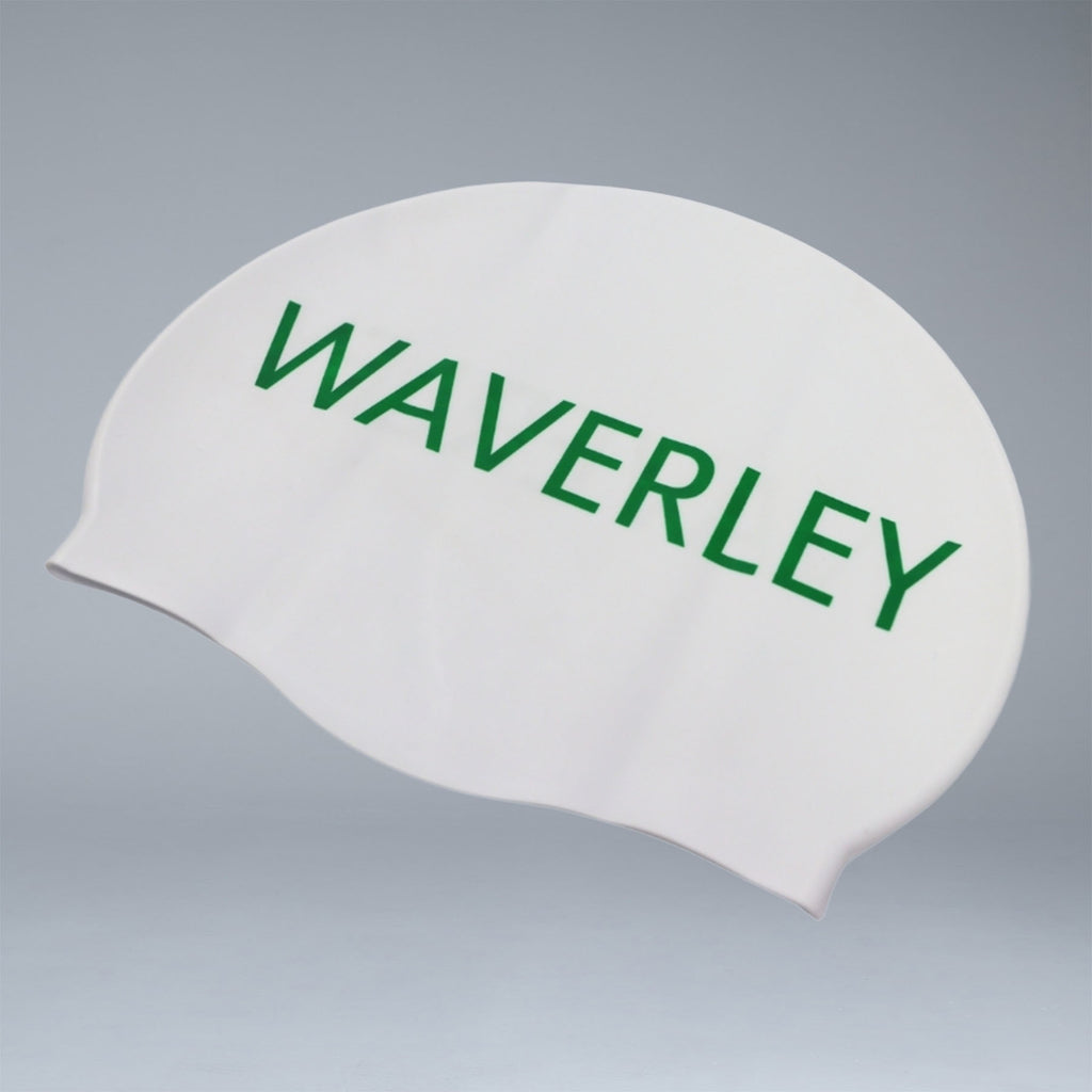 A striking white swim cap with green house name print that perfectly matches Waverley House! Perfect for swim events, triathlons, swimming competitions and school events.