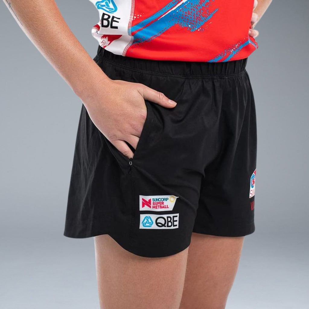 Train like a real SWIFT. These official replica training shorts are perfect for all your netball training along with additional sports activities. Featuring your team's logo and sponsors, these training shorts are designed for movement. The four way stretch fabric is lightweight with wind and water repellent properties.