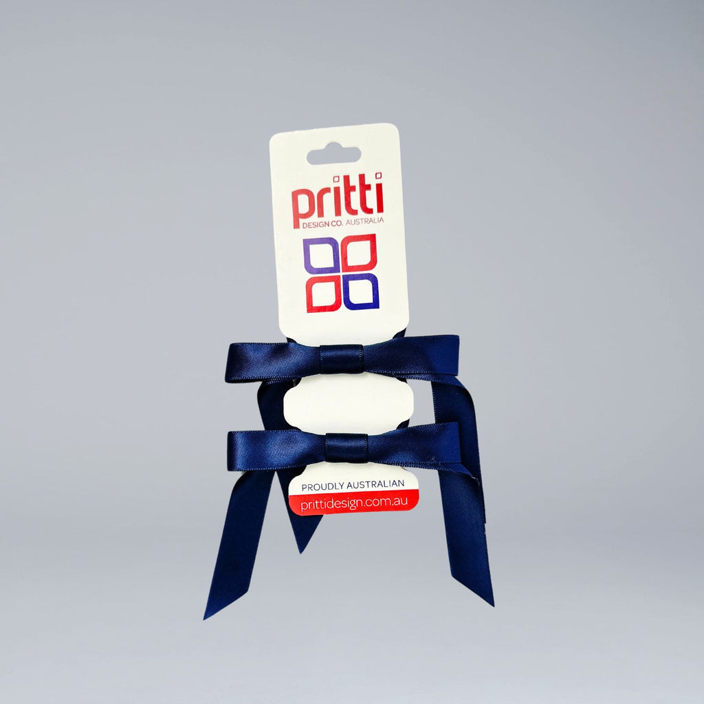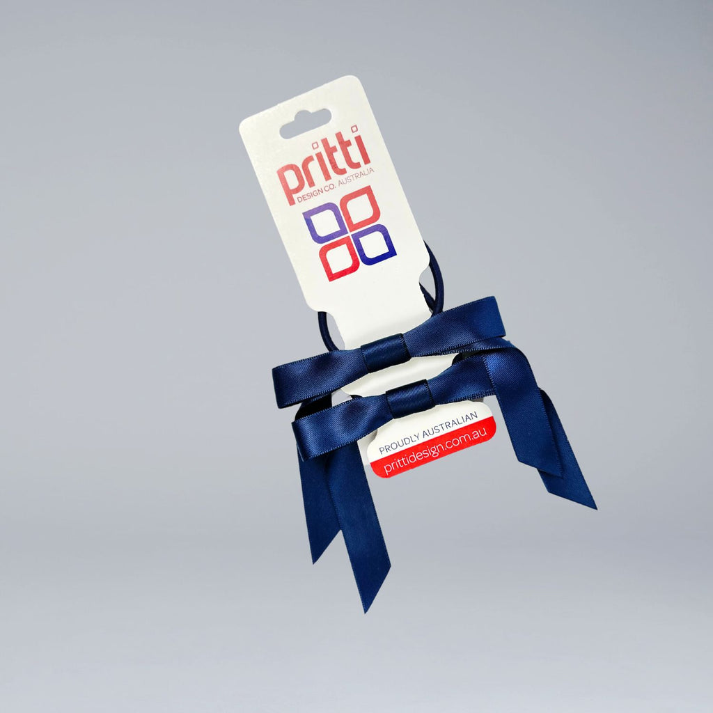 - Navy ribbon bows attached to hair elastic.