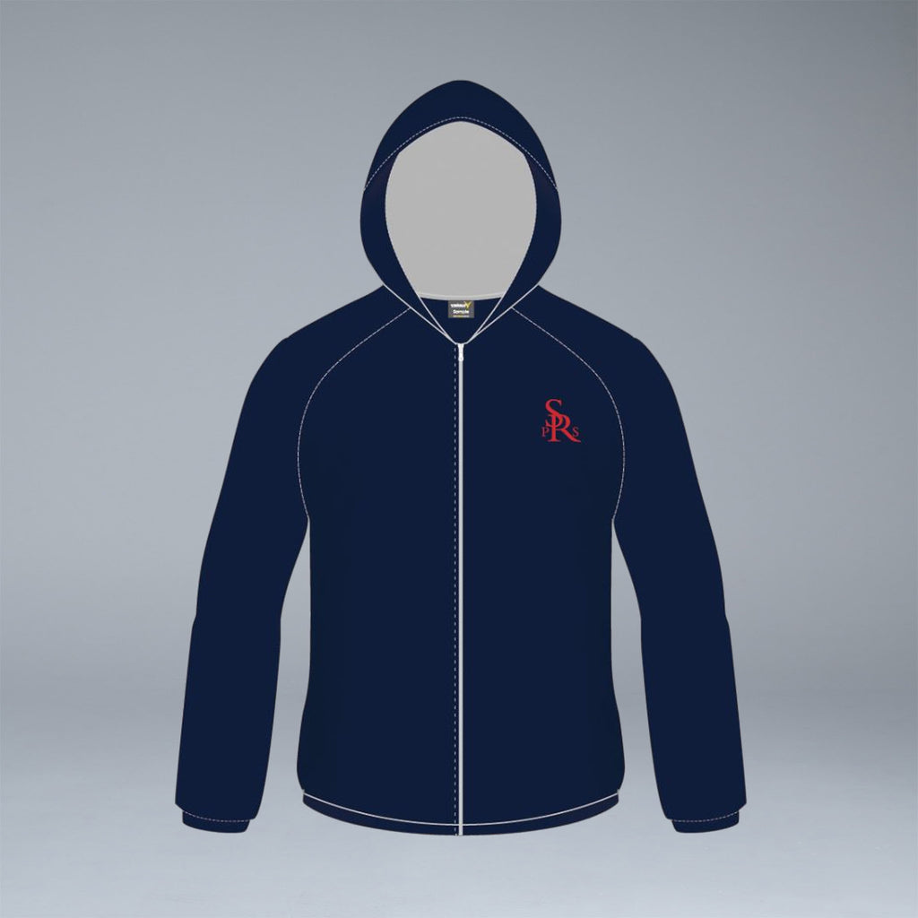 Unisex navy rain Jacket with Sherwood Ridge public school logo.