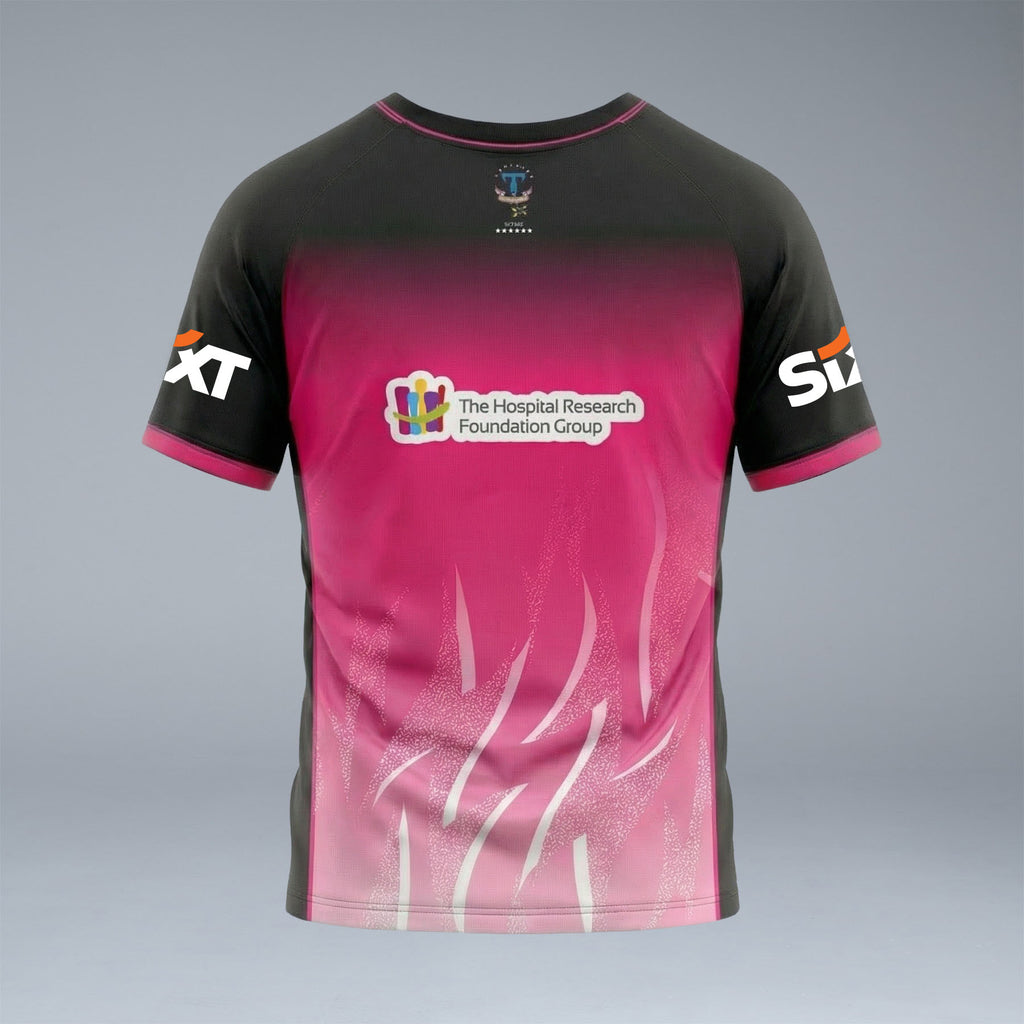 Stay ready for match day with the Thunderbirds Replica Home Warm Up Tee. Featuring a bold gradient design from deep black to vibrant pink, this tee mirrors the professional look worn by the players during their pre-game routines. Detailed with sharp, jagged graphics and official club branding, it is the perfect choice for dedicated fans and athletes alike.